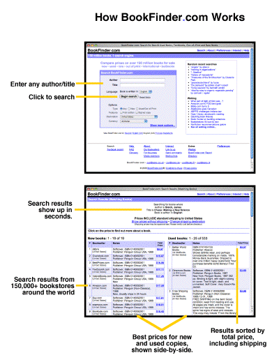 Gestartet im Jahr 1997, wurde das Angebot von BookFinder.com zwei Jahre später um neue Bücher erweitert. 2001 konnte bereits nach Büchern in verschiedenen Sprachen gesucht werden. Seit 2003 wird jedes Jahr der BookFinder.com Report, eine Liste der 100 meistgesuchten vergriffenen Bücher, veröffentlicht. Ab 2006 bieten wir auch die Optionen Preise inklusive Versandkosten zu vergleichen und das neue Europäische Suchmaschinen-Netzwerk von JustBooks zu nutzen.